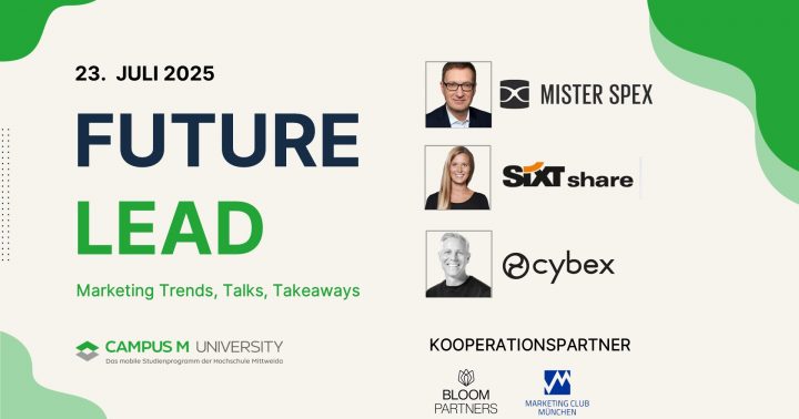 Am 23. Juli 2025 lädt die Campus M University in München zu FUTURE LEAD – einem kleinen, exklusiven Event für alle, die Marketing und Management zukunftsorientiert denken. Im Future Lab präsentieren Studierende frische Perspektiven auf Themen wie Corporate Influencing und Zukunftstrends. Anschließend geben Top-SpeakerInnen aus Unternehmen praxisnahe Einblicke in strategische Transformation, datenbasiertes Management, Nachhaltigkeit und Resilienz:
